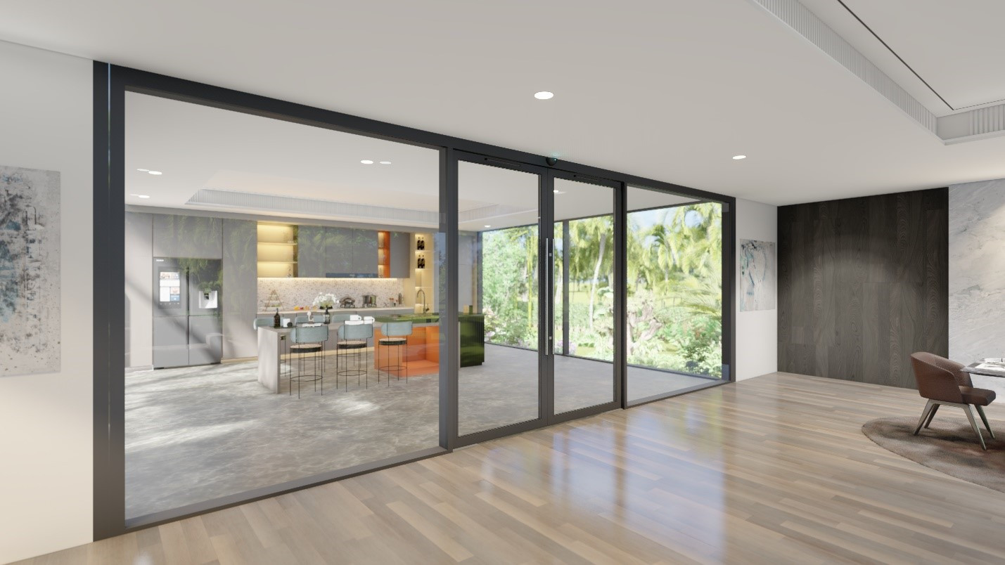 - Cửa gấp trượt dọc tự động thiết kế vừa làm vách kính vừa có thể gấp trượt lên trên theo phương dọc để chuyển đổi thành mái hiên nhỏ, mở ra tầm nhìn thoáng đãng, giúp tăng khả năng lấy sáng, lưu thông gió tự nhiên và có khả năng che mưa nhất định. Vận hành êm ái, sản phẩm có tiện ích nâng cao khi cho phép tùy chọn cảm biến, tự động đóng lại nếu trời mưa.