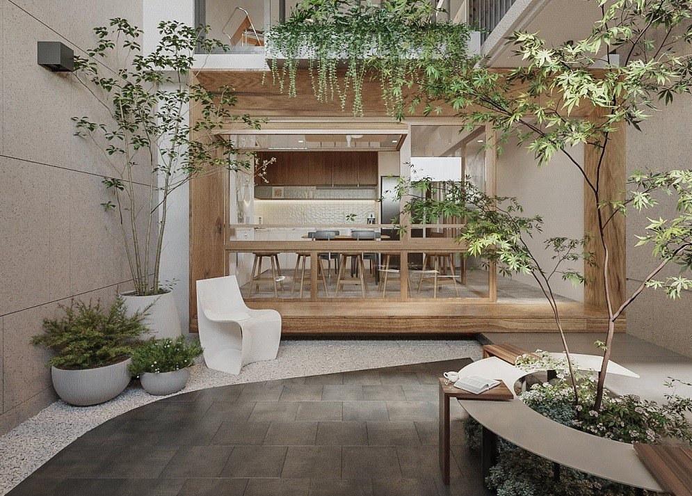 Cửa gấp trượt dọc trong không gian bếp mở thoáng với view sân vườn biệt thự.