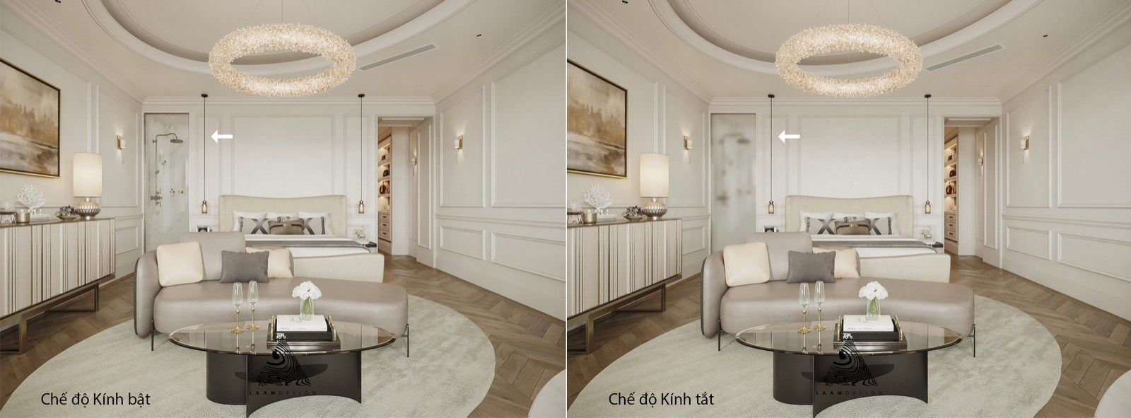 Kính điện đổi màu lắp đặt ở khu vực phòng tắm cạnh phòng khách biệt thự, giúp lấy sáng tự nhiên nhưng vẫn đảm bảo riêng tư, kín đáo khi cần.