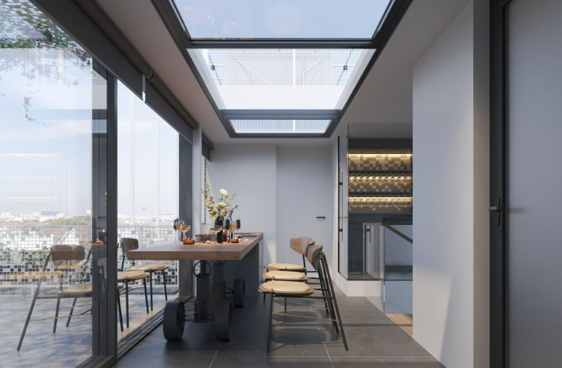 - Mái nhà, skylight: Cửa sổ trời Skylight cảm biến thời tiết (tự động đóng khi mưa, thoát khói/nhiệt qua app + báo cháy).