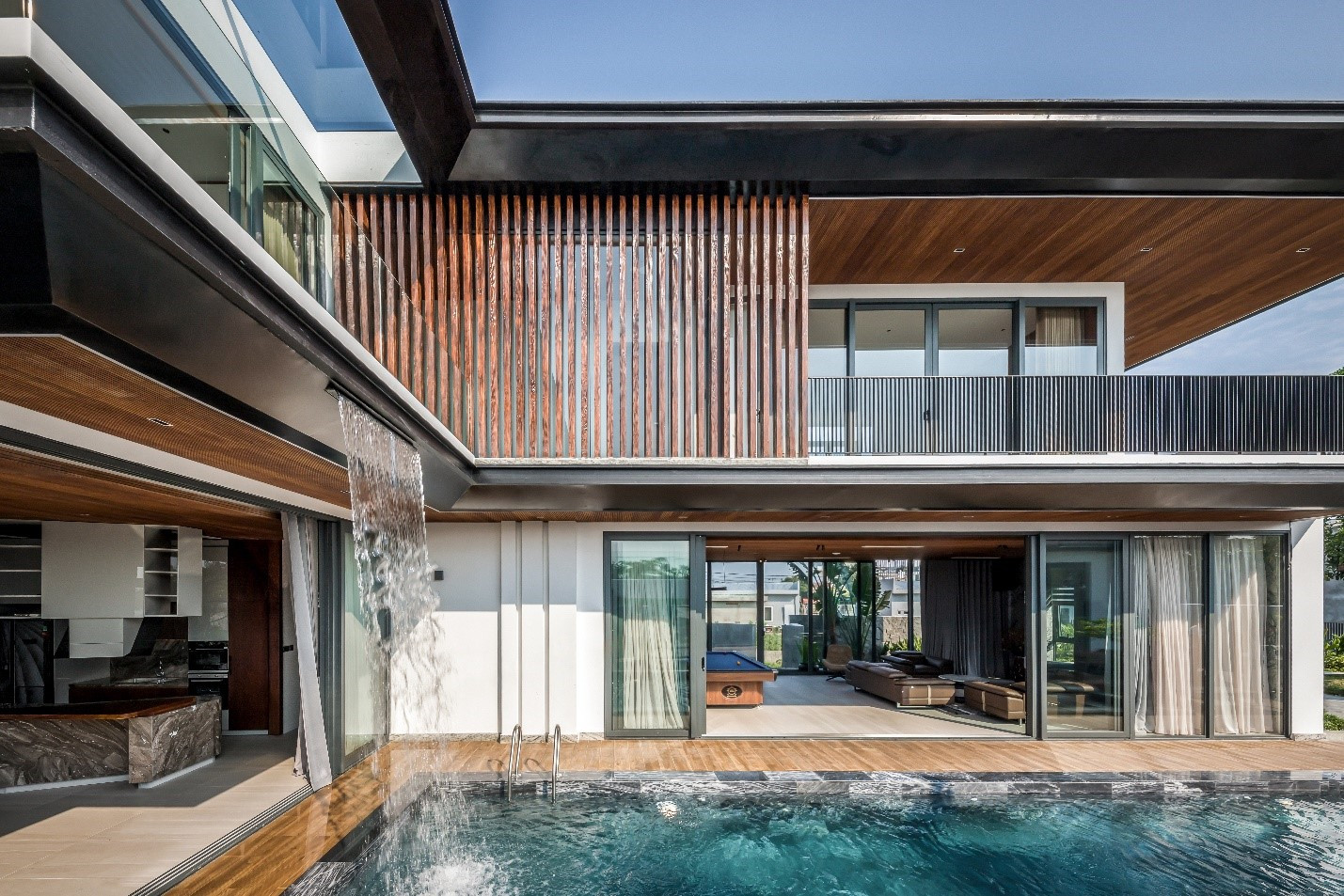 Mẫu cửa ban công nhôm kính xếp trượt góc 90 độ được gia chủ lựa chọn cho căn biệt thự mặt phố nhằm tối ưu không gian mở ra hồ bơi tầng thượng, là địa điểm lý tưởng cho những buổi tiệc tùng sum họp gia đình.