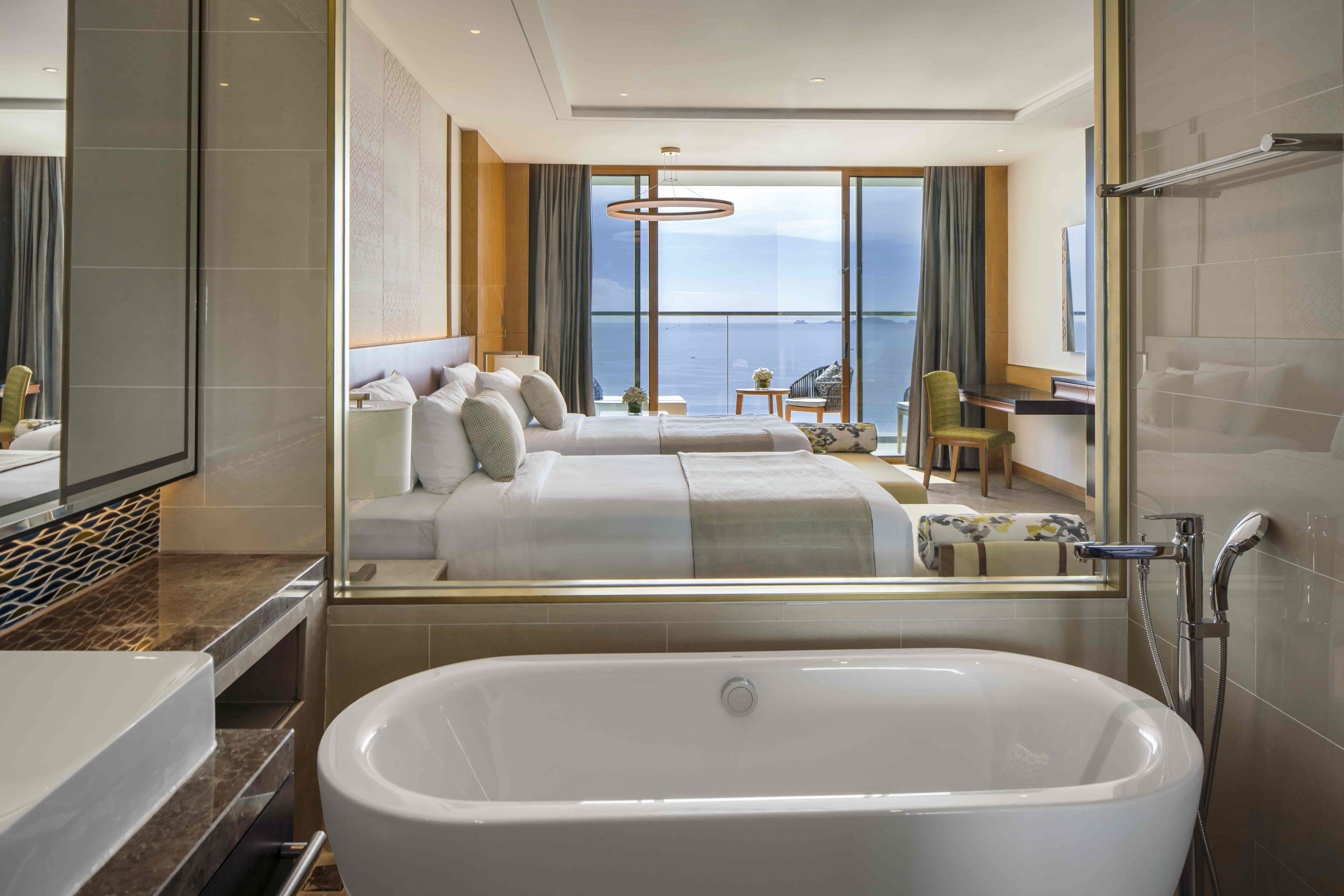 Vách kính cường lực ngăn cách phòng ngủ và phòng tắm.