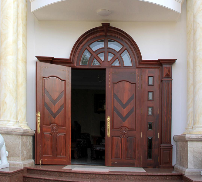 - Cửa gỗ tự nhiên 2 cánh: Mang lại vẻ cân đối, rộng rãi, thích hợp làm cửa đi chính, tạo sự bề thế, đẳng cấp cho không gian.
